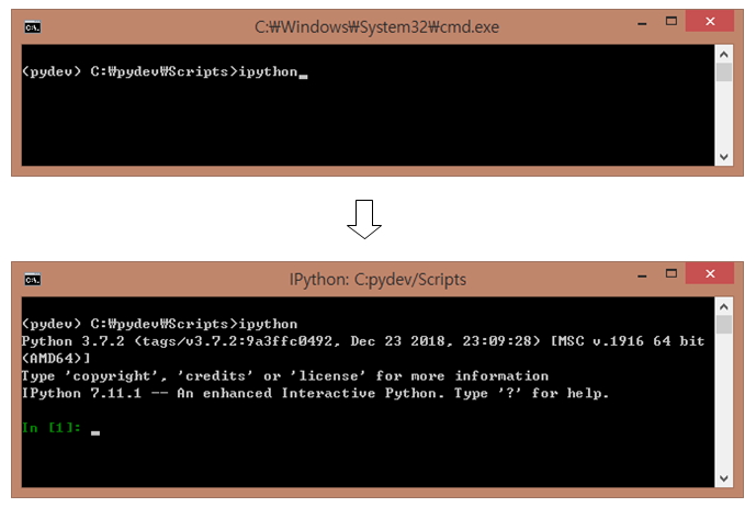 그러면 pip는 PyPI와 연결하여 ipython 패키지를 설치하는 데 필요한 작업들을 진행하게 된다. 에러없이 ipython이 설치된 경우, 명령 프롬프트에서 ipython을 입력하면 ipython을 실행하게 된다.