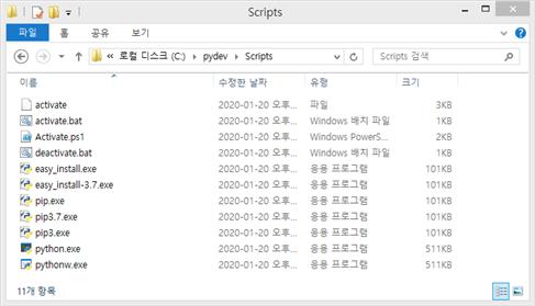 우선, 탐색기를 활용하여 가상환경 경로 아래의 Scripts 폴더에 들어가 보자. 그럼, 다음 그림과 같이 activate.bat 파일을 비롯한 10여개의 파일들을 볼 수 있다.