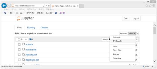에러 없이 설치되었다 싶으면, 명령 프롬프트에서 jupyter notebook이라고 입력한다. 그러면, 몇 줄의 텍스트가 화면에 보이면서, 아래와 같이 기본으로 설정되어 있는 웹브라우저에 주피터 노트북이 실행되는 것을 확인할 수 있다.