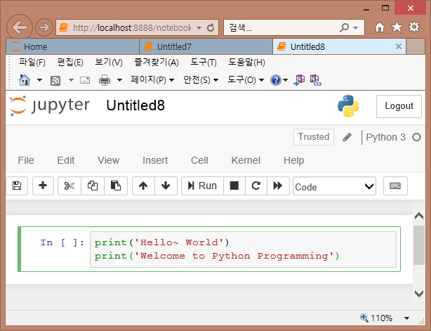 두번째 줄에 print('Welcome to Python Programming') 이라는 명령어를 입력해 보자. 그러면 아래 그림과 같이, 2줄의 코드를 만들 수 있게 된다.