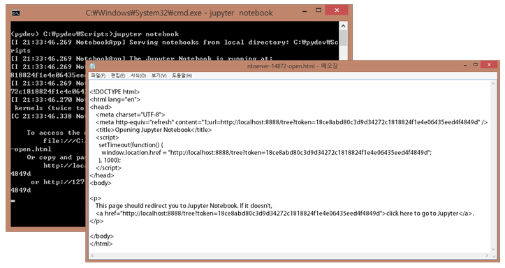 사용중인 운영체제의 버전에 따라 주피터 노트북이 바로 실행되지 않고, 아래와 같이 메모장이 뜨는 경우가 있다.