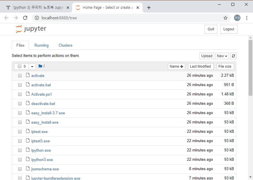 에러 없이 설치되었다 싶으면, 명령 프롬프트에서 jupyter notebook이라고 입력한다. 그러면, 몇 줄의 텍스트가 화면에 보이면서, 아래와 같이 기본으로 설정되어 있는 웹브라우저에 주피터 노트북이 실행되는 것을 확인할 수 있다.
