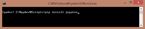 우선, 주피터 노트북을 우리의 가상환경에 설치해 보자. 다음 그림과 같이 명령 프롬프트에 pip install jupyter를 입력하고 엔터키를 누른다. 그러면, ipython 설치과정과 비슷한 과정들이 진행되면서 주피터 노트북이 설치된다. 설치과정에서 여러번의 프로그레스 바 progress bar (설치율을 보여주는 막대모양의 차트) 를 보게 되는데, 주피터 노트북 패키지를 구성하는 여러 가지 모듈들을 설치하는 과정이라고 생각하면 되겠다.