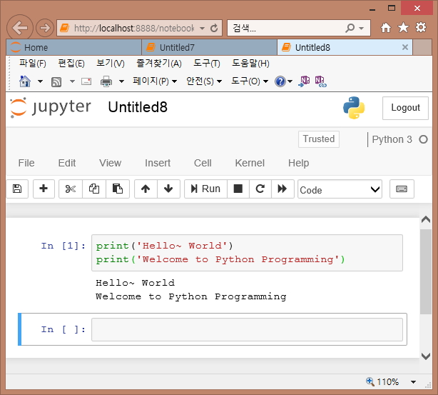 두번째 줄에 print('Welcome to Python Programming') 이라는 명령어를 입력해 보자. 그러면 아래 그림과 같이, 2줄의 코드를 만들 수 있게 된다.