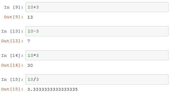 숫자 데이터의 기본 연산으로는 사칙연산 (+, -, *, /) 이 있다. 두 개의 정수값 10과 3의 사칙연산 결과를 보면 다음과 같다. 덧셈을 나타내는 연산자는 +, 뺄셈 연산자는 -, 곱셈 연산자는 * (키보드에서 숫자 8에 있는 별 모양 심볼), 나눗셈 연산자로는 /를 사용한다.