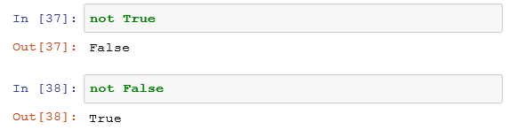 not 연산은 피연산자가 1개인 unary 연산이다. 참인 명제를 "아니다" 라고 하면 거짓이 되고, 거짓인 명제를 "아니다"라고 하면 참이 된다. "나는 키가 크다" (실제로). 그런데, 그런 나를 가리키며 "그렇지 않다"라고 하면 잘못된 (false) 판단이 되는 것이다. not 연산의 진리표를 보면 다음과 같다.