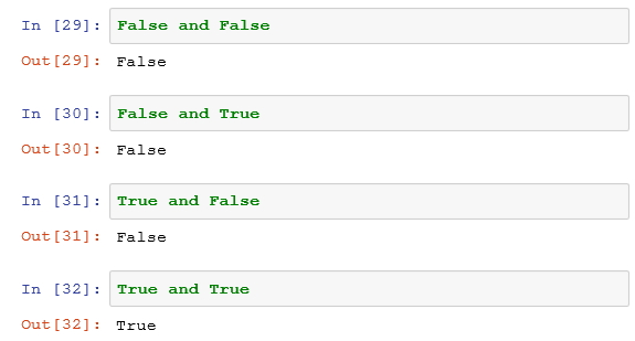 정리해 보면, 단순한 명제를 조합해서 복합적인 명제를 만들 수 있는데, 복합적인 명제의 참/거짓 값은 그 명제를 구성하는 단위 명제의 참/거짓 값과 복합방법에 따라 결정된다. 예를 들어 and 연산의 경우는 다음의 표와 같다. # 이 표를 진리표 (truth table)라고 부른다.